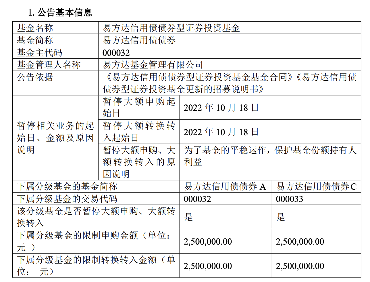 10月17日,易方达基金管理有限公司发布公告称,决定自2022年10月18日起暂停易方达信用债债券型证券投资基金A类基金份额和C类基金份额机构客户在全部销售机构的大额申购、大额转换转入业务,单日单个基金账户在全部销售机构累计申购(含定期定额投资及转换转入)本基金A类基金份额或C类基金份额的金额不超过250万元(含)。