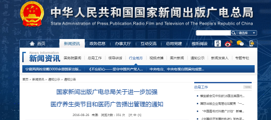 8月24日,总局印发《国家新闻出版广电总局关于进一步加强医疗养生类节目和医药广告播出管理的通知》。针对当下一些节目存在的非法兜售药品、保健品和医疗服务以及播放虚假医药广告等问题,《通知》要求进一步加强播出管理。