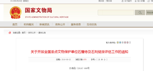 国家文物局网站8月22日消息,为全面掌握全国重点文物保护单位中石窟寺及石刻的健康状况和病害情况,及时采取有效措施排除安全隐患,科学规划“十三五”期间相关保护展示项目,不断提升石窟寺及石刻类文物的保护、管理、展示和利用的整体水平,近日,国家文物局发布通知,决定开展全国重点文物保护单位石窟寺及石刻健康评估工作。