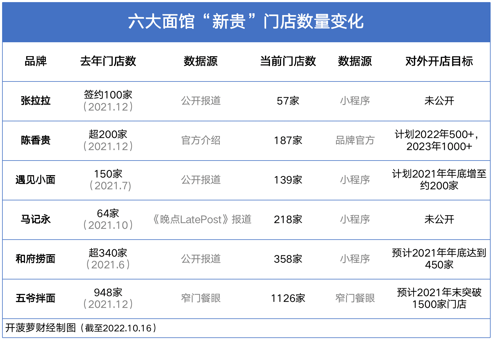 餐饮赛道投资人李蔡对开菠萝财经形容,六大面馆“新贵”去年“开店热”,今年“闭店潮”,“有的是疫情影响下的批量关店,有的是大举扩张后的门店调整”。