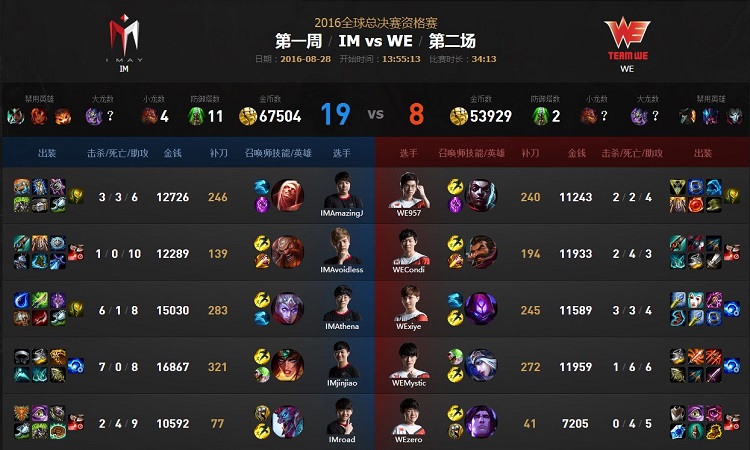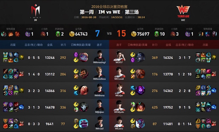 但WE战队依然凭借烬的大招打出1500的暴击秒掉轮子妈抢下大龙,并打的对方一波小团灭。但在之后的上高被IM上单泰坦绕后,击杀辛德拉。WE战队输出不足,面对轮子妈的爆炸输出无可奈何。最终IM战队一波直接拆掉基地,取得S6总决赛最后一张门票。