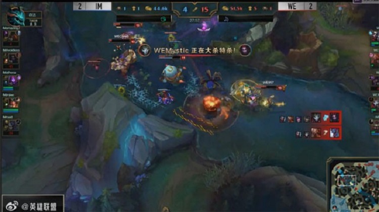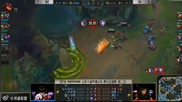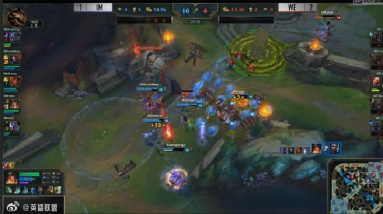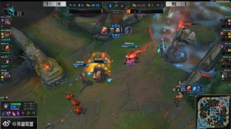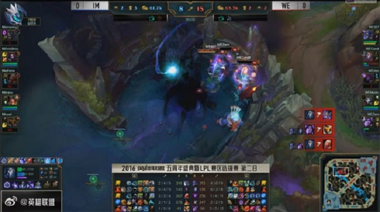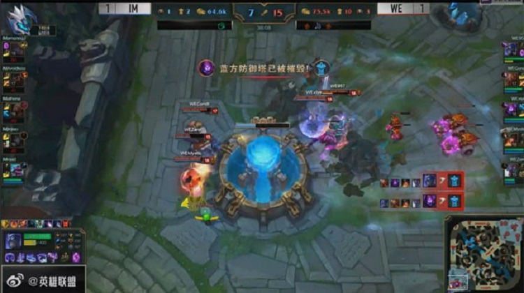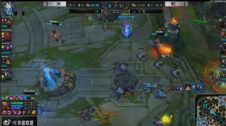 IM打野蜘蛛想偷蓝,却被WE发现,虽然IM泰坦和玛尔扎哈都迅速前来支援,但WE此时装备已经碾压,上单艾克收获双杀,IM再次阵亡三人,劣势已经愈加明显。