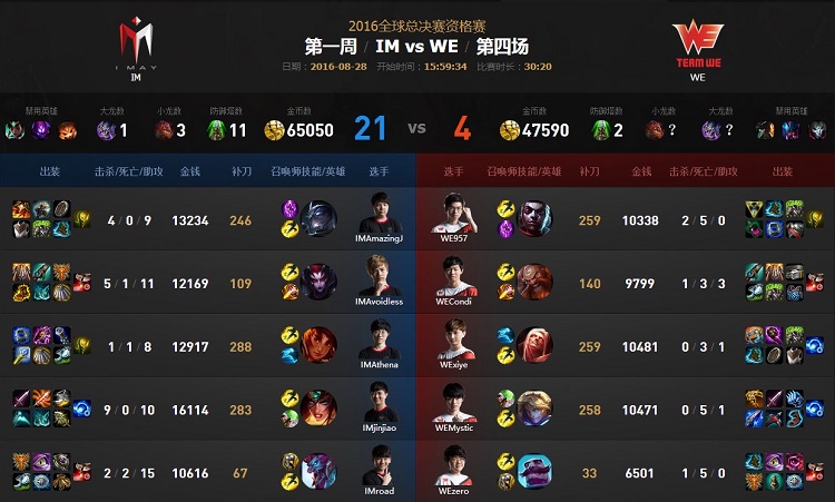 最终,利用大龙BUFF,IM逼迫WE高地强行开团,以0换4拿下这局,双方进入决胜局。