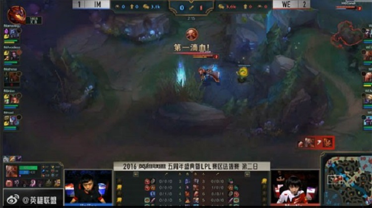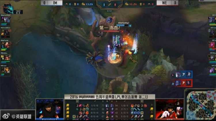 8分钟的时候,双方打野同时支援上路,WE慎优先收掉IM蜘蛛的人头拿到本场比赛第一滴血,而IM巨魔也是收到千珏的人头,双方打野互换。