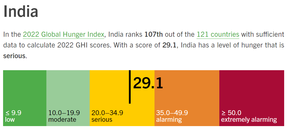 相较于2021年,印度的全球饥饿指数排名下降了6位,在全部评估的121个国家中排名第107位。半岛电视台指出,印度已连续多年排名下降。