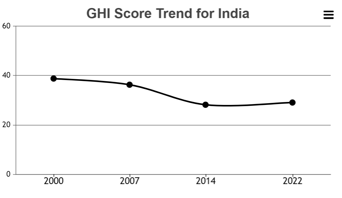 不过,为了纵向衡量比较某个国家的持续表现,每一年的指数包括三个指定参考年份。印度2022年的GHI得分可以直接与2000年、2007年以及2014年的GHI得分进行比较。