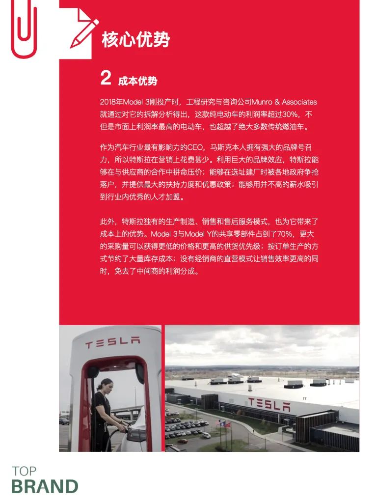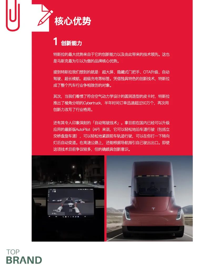 特斯拉的最大优势来自于它的创新能力以及由此带来的技术领先。这也是马斯克最为引以为傲的品牌核心优势。