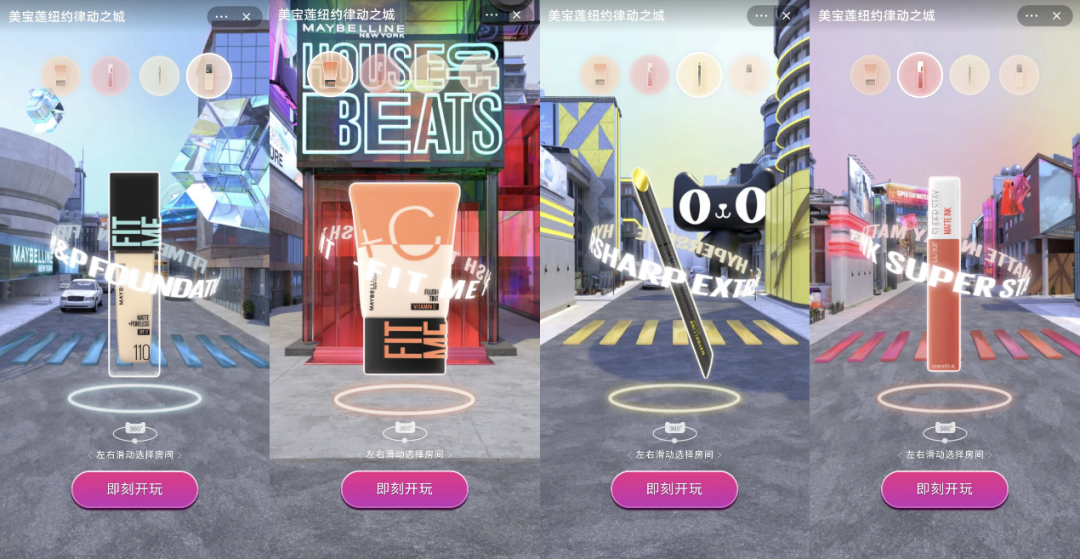 用户进入美宝莲纽约天猫官方旗舰店和天猫官方直播间即可载入「律动之城」传送门,开启最前卫的美妆宇宙旅程。驶入「律动之城」,四大元宇宙空间轮番互动,带来元宇宙新“妆”备:FITME Pro粉底液、早C管素颜霜、开挂眼线笔、接吻棒不同空间设置不同的玩法,在趣玩互动的同时展示产品卖点和品牌调性。