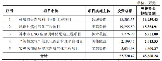 招股书显示,募集资金将主要用于韩城市天然气利用三期工程项目、凤翔县镇村气化工程项目、神木市LNG应急调峰储配站工程项目、“智慧燃气”信息化综合管理平台项目以及宝鸡凤翔机场空港新城气化工程项目。