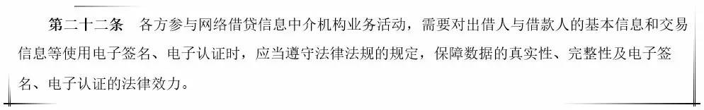 近期发布的《网络借贷信息中介机构业务活动管理暂行办法》也认可了电子签名的合法性,其第二十二条做出了如下规定: