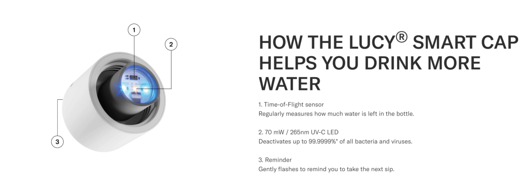非常值得一提的便是Lucy智能瓶盖,它主要通过紫外线辐射系统对水进行杀菌和过滤,可以以接近100%的灭活效率杀死水中潜在的病毒和致病细菌。同时,Lucy智能瓶盖还与Waterdrop自主研发的Hydration App联动,长期跟踪和记录消费者的饮水行为,并按时提醒消费者正确的饮水时间,帮助消费者养成良好的饮水习惯。