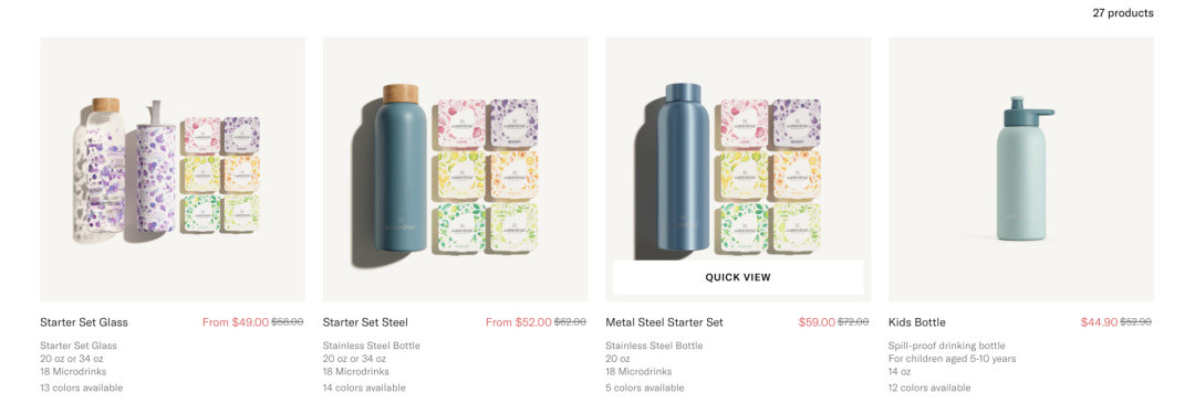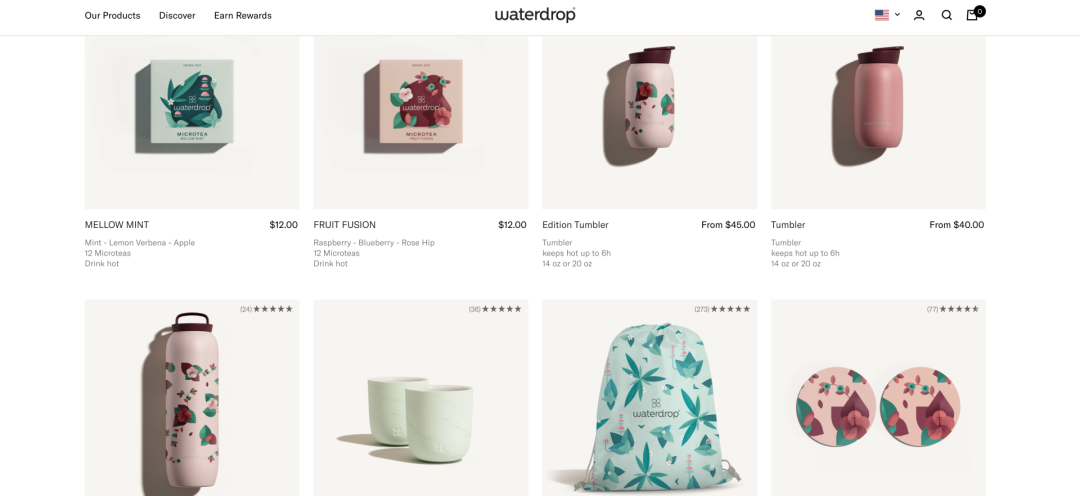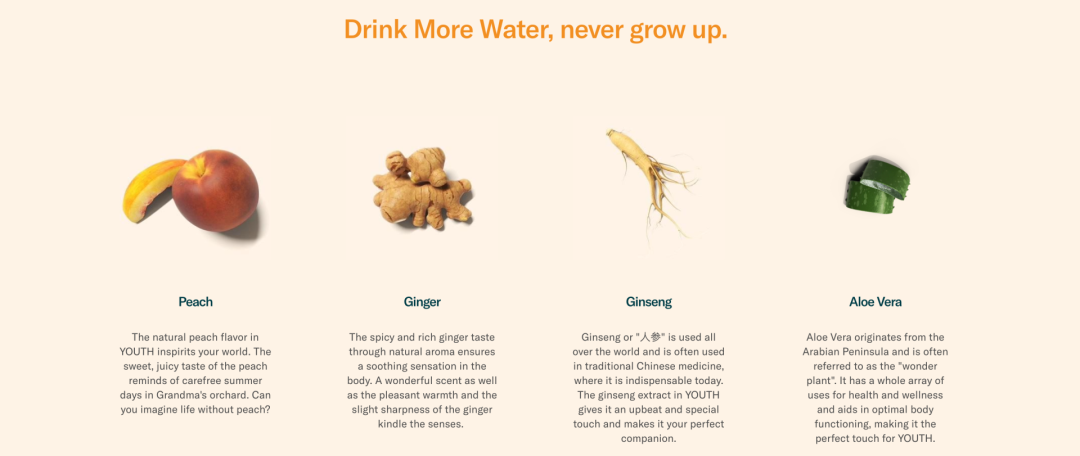 Waterdrop的产品线主要包括两类产品:无糖小方块(Microdrink)和饮水器具(Drinkware)。无糖小方块主要以盒装形式出售,一盒包括12颗方块。Waterdrop还专门为无糖方块产品线设置了两款细分产品——无糖方块饮和无糖方块茶。其中,无糖方块饮包含14种口味,成分主要包括14种不同的植物,并且不同的植物成分对应不同营养功效的方块。比如YOUTH系列方块则主要由青春抗老的维生素(维生素C、B2、B3)和养生植物(人参、芦荟、桃、生姜)组成。