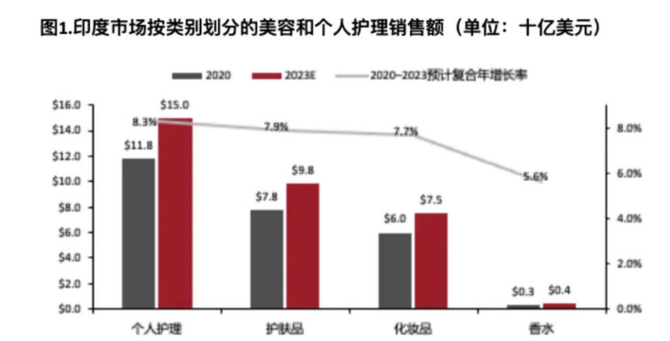 随着人均收入的增加,印度人在美容和个护方面的花费也日益见涨。根据Statista的数据,2020年印度美妆市场的人均支出约134元,预计到2023年将增至约165元。