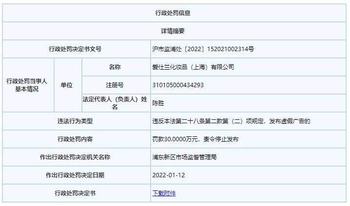 今年,因“干细胞”面膜被罚并非只有欧华妍一家。今年1月,爱仕兰化妆品(上海)有限公司(以下简称“爱仕兰”)就因在一款面膜产品预售宣传中违规宣称“干细胞”被处罚款30万元。