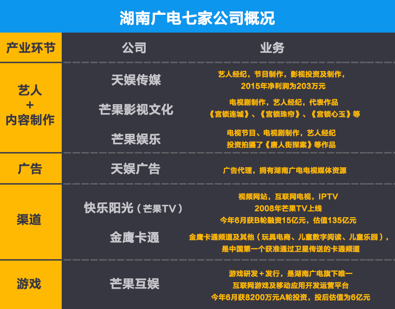 细看这7家公司的业务内容,天娱传媒、芒果影视文化、芒果娱乐三家公司都拥有艺人经纪+内容制作的业务板块;天娱广告则承担广告营销服务;芒果互娱在游戏产业从制作到发行进行全产业链布局,并可以依托湖南卫视获得渠道资源;在产业最下游的渠道上,快乐阳光(芒果TV)和金鹰卡通则分别布局互联网视频、儿童电视渠道。