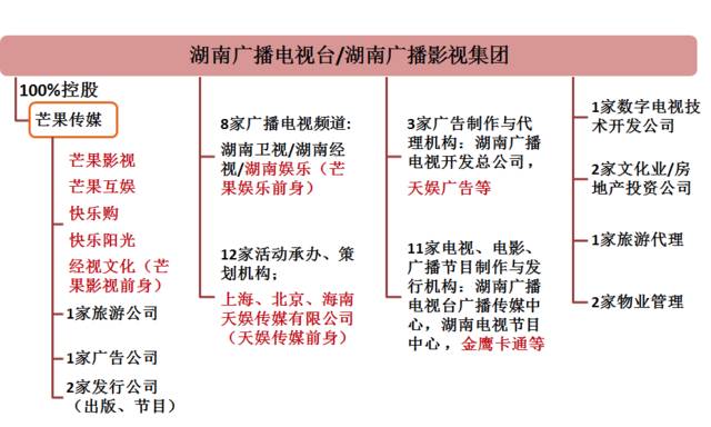 根据快乐购IPO招股说明书,截至2014年6月,湖南广播电视台(湖南广播影视集团)旗下除芒果传媒及下属公司外,共有下属事业单位及有经营行为的控股企业共40家,内容涵盖广播电视频道、内容制作与发行、技术研发、旅游酒店、活动策划承办、投资机构、物业管理等方面。