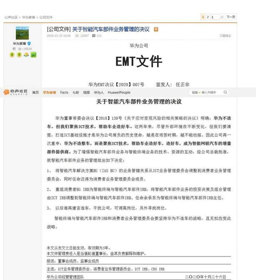 2020年10月,曾流传出一份华为创始人任正非签发的华为EMT决议,表示华为不造整车,而是聚焦ICT技术,帮助车企造好车。