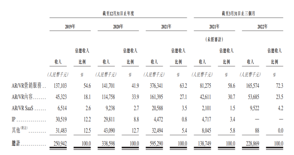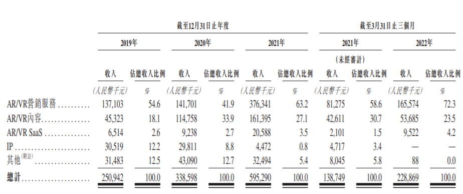 时至今日,改名为后的飞天云动已经完全将自己的主营业务进行了转型与优化,根据《招股书》,目前飞天云动的主营业务分为四项:AR/VR营销服务、AR/VR内容、AR/VR SaaS与IP业务。