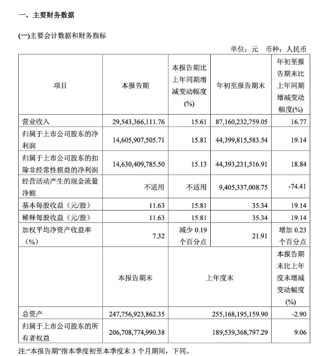 从单季度来看,贵州茅台Q3实现营收295.43亿元,同比提升15.61%;归属于上市公司股东的净利润为146.06亿元,同比提升15.81%。