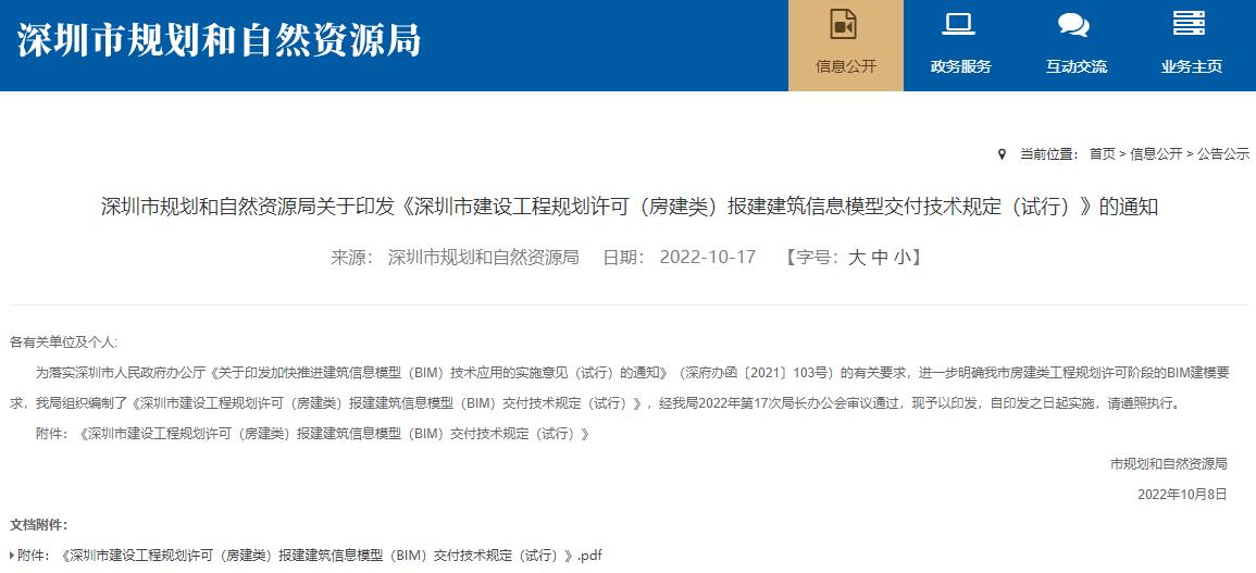 日前,深圳市规划和自然资源局印发了《深圳市建设工程规划许可(房建类)报建建筑信息模型交付技术规定(试行)》的通知。