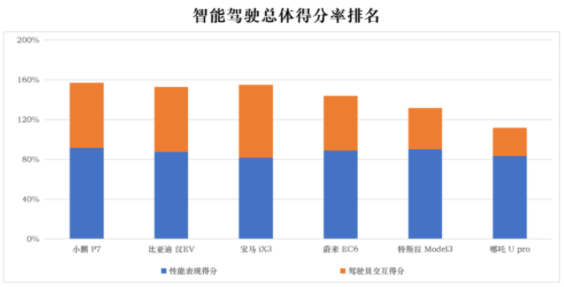 小鹏P7的跟车能力得分95%,但弯道组合控制能力得分垫底,仅为76%。
