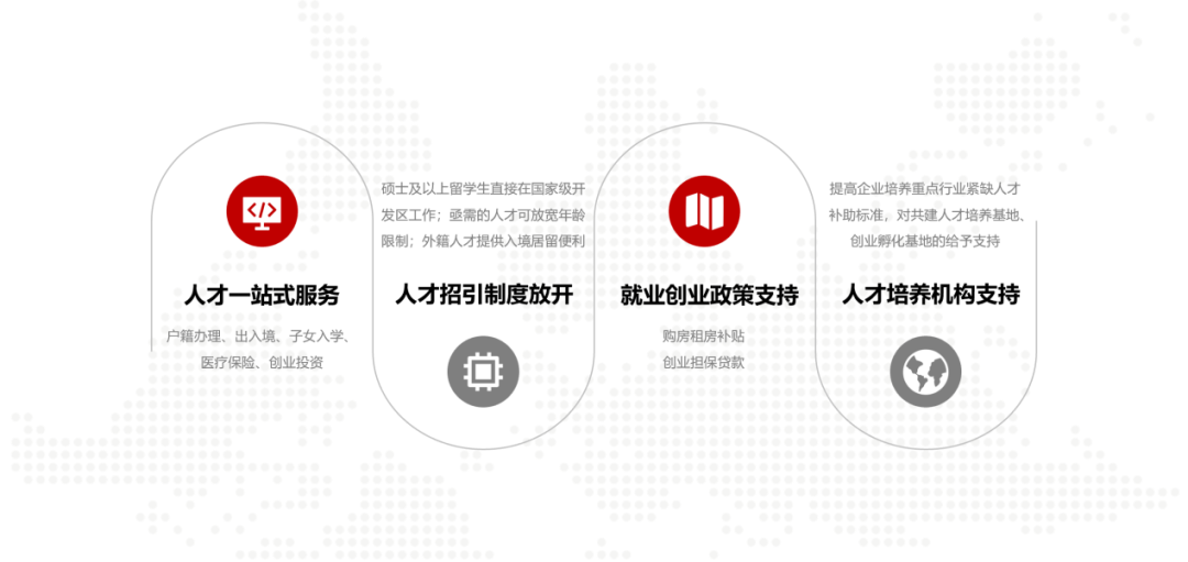 第四个是人才要素,随着产业变革的加剧,高技术人才紧缺问题成为我国和各个开发区的共性痛点,政策要求开发要从多个维度发力,变人才外流现状为人才回流。譬如提供人才一站式服务,对留学生和外籍人才,免考核或放宽年龄限制,吸引人才在开发区工作,对人才就业和创业方面提供支持和补贴等等;除了针对人才的政策,针对人才培育机构也同样有相应的支持政策,譬如提高企业培养重点行业紧缺人才补助标准,对共建人才培养基地、创业孵化基地的给予支持等等。