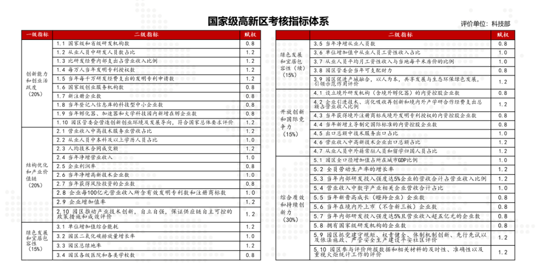 除了对经开区进行评价,科技部对高新区也有一套评价体系,包括创新能力和创业活跃度、结构优化和产业价值链、绿色发展和宜居包容性、开放创新和国际竞争力、综合质效和持续创新力五个维度。从两个评价体系可以看出,国家对开发区的评价,已经从原有的总量为先的评价标准,变成综合要求开发区对外开放能力、产业创新能力、绿色发展能力、协同发展能力等多个维度的共同发展。