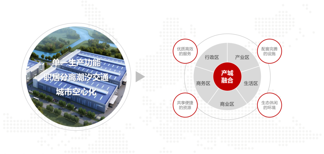 主要针对的早些年偏郊区的开发区,由于是单一生产功能,职居分离产生了大量潮汐交通压力,工作生活非常不方便,即或开发区配套了一点基本生活功能,也于事无补。