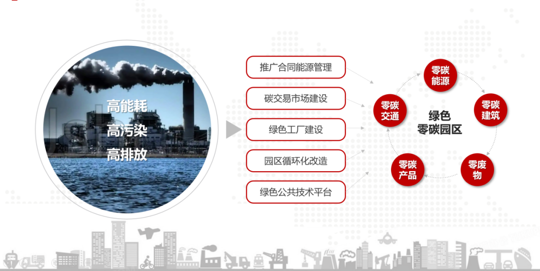 要求开发区摒弃原有的高能耗、高污染、高排放发展路径,践行国家最新的碳中和发展理念,推进开发区绿色工厂建设、循环化改造和绿色公共技术平台建设,积极参与碳交易市场建设,推广合同能源管理项目,从零碳交通、零碳能源、零碳建筑、零废物和零碳产品等维度发力,逐渐将开发区建设成绿色零碳园区。
