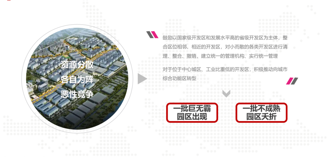 随着粗放式增长模式逐渐疲软,如何克服“诸侯割据”式行政架构带来的资源分散、各自为阵、恶性竞争的弊端,成为开发区发展中必须要破解的重要课题。国家政策中提到“鼓励以国家级开发区和发展水平高的省级开发区为主体,整合区位相邻、相近的开发区,对小而散的各类开发区进行清理、整合、撤销,建立统一的管理机构、实行统一管理,对于位于中心城区、工业比重低的开发区,积极推动向城市综合功能区转型”由此可见,未来,通过开发区之间的整合优化,将会有一批巨无霸园区出现,同时,也会有一批不成熟园区夭折。