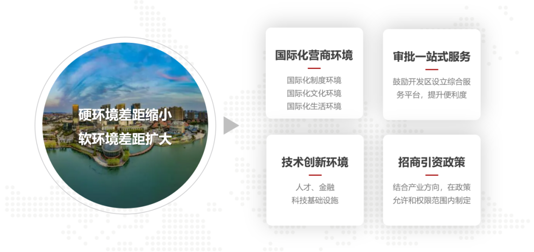 我们总结政策主要有四点要求,第一点是要营造国际化的营商环境,包括国际化制度环境、文化环境和生活环境,来吸引国际化的企业和人才;第二是要提供审批一站式服务平台,提升企业经营便利度;第三点是要打造技术创新环境,优化人才、金融服务,提升科技基础设施布局;第四点是要结合自身的发展和产业方向,在政策允许和权限范围内制定招商引资政策。