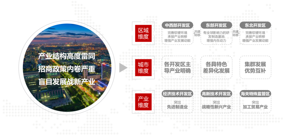 针对全国开发区产业结构高度雷同、招商政策内卷严重、盲目发展战新产业等问题,政策对开发区的发展格局从区域、城市、产业三个维度做了要求。