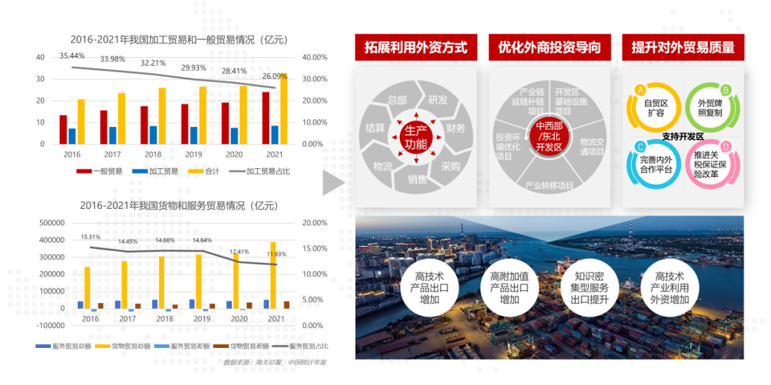 近年来,虽然我国加工贸易占比不断下降,但服务贸易占比也持续下降,对外开放格局有待进一步优化,因此,政策要求开发区要转变开放思维。