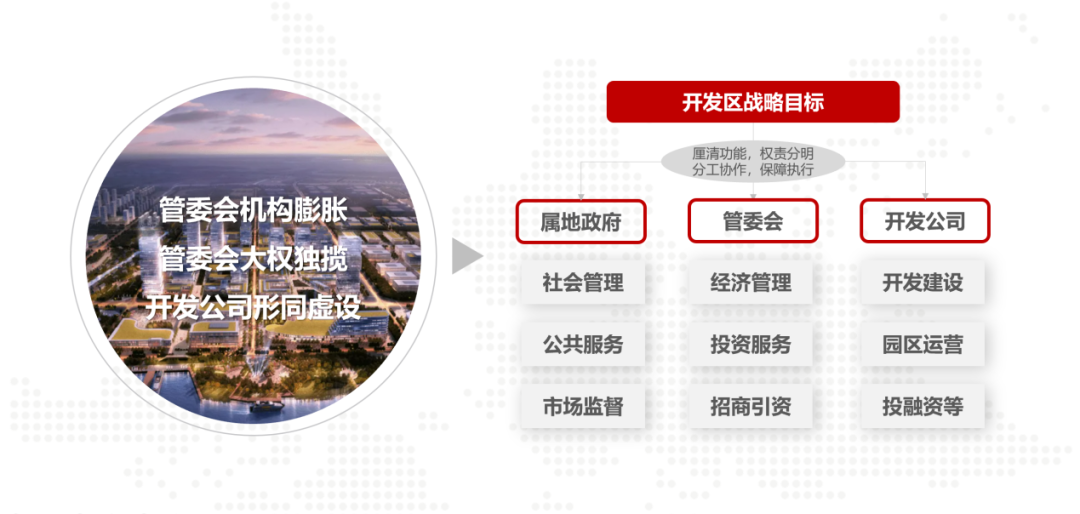 由于历史原因,目前开发区大多面临体制机制问题,比如管委会机构极其膨胀,且大权独揽,属地政府和管委会之间的权责划分不清晰,开发公司形同虚设,等等。政策要求开发区从政企不分到深化改革,就是要求属地政府、管委会、开发公司三者厘清各自功能,权责分明、分工协作,保障执行的有效性,共同推进开发区战略目标的达成。属地政府做好社会管理、公共服务、市场监督工作,管委会主抓开发区的经济管理、投资服务、招商引资工作,而开发公司则主要遵循市场化规律,推进开发区进行开发建设、园区运用、投融资等工作。
