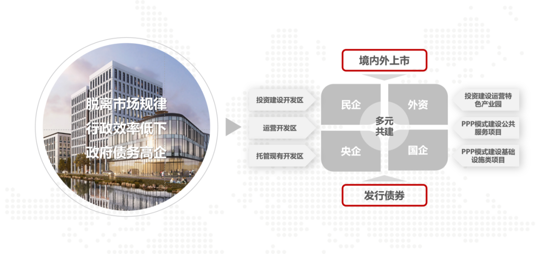 政府主导开发区建设容易出现脱离市场规律、行政效率低下、政府债务高企等问题,因此,政策重点支持民企、外资、央企、国企等市场主体共同投资建设、运营托管开发区,譬如鼓励市场多元主体投资建设运营特色产业园,鼓励以PPP模式建设公共服务项目和基础设施类项目等等。同时也支持市场化开发区开发主体通过境内外上市和发行企业债券等方法进行融资,突破开发区开发资金瓶颈。