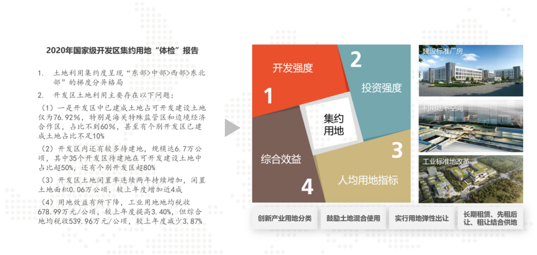 随着土地资源的日益紧缺,国家也要求开发区要从粗放用地到集约用地,在集约用地评价上,要强调开发强度,投资强度、人均用地指标和综合效益等;在集约用地方式上鼓励开发区建设标准厂房、利用地下空间、推动工业标准地改革;在土地出让方式上,鼓励创新产业用地分类、鼓励土地混合使用、实行弹性出让和长期租赁、先租后让、租让结合供地,提高土地集约利用效率。