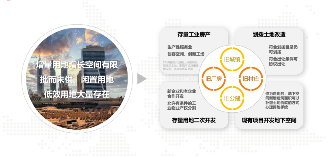 经过多年粗放式发展,开发区增量用地增长空间有限,也有很多批而未供、闲置用地、低效用地存在,因而,政策要求未来开发区在土地使用方向,要从增量用地转变成存量用地思维。充分利用旧城镇、旧厂房、旧村庄、旧共建等设施,推进存量工业房产更新为生产性服务业和创客空间等新型产业载体;鼓励对原有低效划拨用地进行改造,鼓励存量用地二次开发,让新企业和老企业合作开发,在条件合适的时候,也可以对工业物业进行产权分割;另外,还鼓励对现有项目的地下空间进行挖掘,提高存量项目的土地效率。
