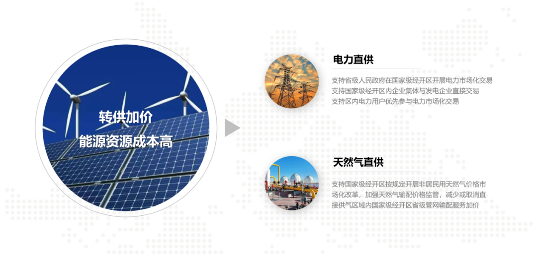 第三个要素是能源,包括电力和天然气,鼓励从开发区的大客户从原有的转供模式变成直供模式,以此降低能源要素成本。比如在电力直供方面,政策支持国家级经开区内企业集体与发电企业直接交易,支持区内电力用户优先参与电力市场化交易;在天然气直供方面,支持国家级经开区按规定开展非居民用天然气价格市场化改革,加强天然气输配价格监管,减少或取消直接供气区域内国家级经开区省级管网输配服务加价。