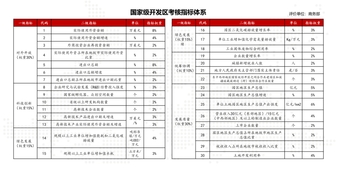 2021年11月,商务部出台了国家级经济技术开发区综合发展水平考核评价办法,提出了对开发区综合考评的五大类指标体系,原来最为看重的发展质量只占到开发区综合评价的30%权重,其他四类分别为对外开放,科技创新、绿色发展、统筹协调,对外开放占30%权重,要求开发区要继续扩大开放质量;科技创新和绿色发展各占15%,也能看出开发区可持续发展的重要性,而统筹协调占比10%,比如东中西区域合作共建园区和边合区也成为考核的重点。