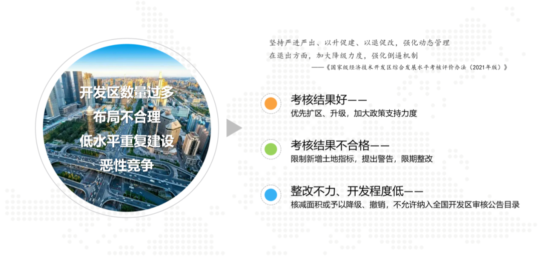 目前,开发区数量过多,布局不合理、低水平重复建设和恶性竞争问题严重,因此政策要求开发区要坚持严进严出,以升促建、以退促改,强化动态管理,在退出方面,加大降级力度,强化倒逼机制,对考核结果好的开发区优先扩区、升级,加大政策支持力度;对考核结果不合格的开发区限制新增土地指标,提出警告,限期整改;对整改不力、开发程度低的开发区,核减面积或予以降级、撤销,不允许纳入全国开发区审核公告目录。