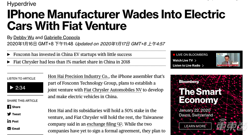 其实,早在2020年,富士康母公司鸿海科技集团就传出要造车的消息了。2020年1月,彭博社报道,鸿海计划与菲亚特克莱斯勒(英文简称FCA)组建合资企业,以便在中国开发和生产电动汽车。