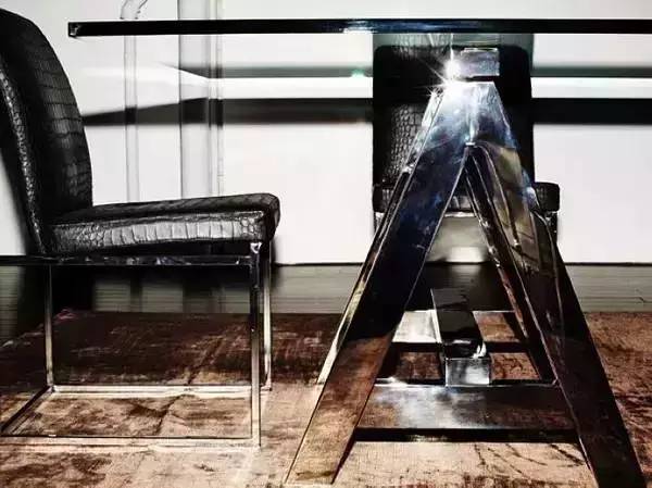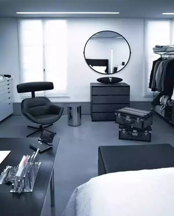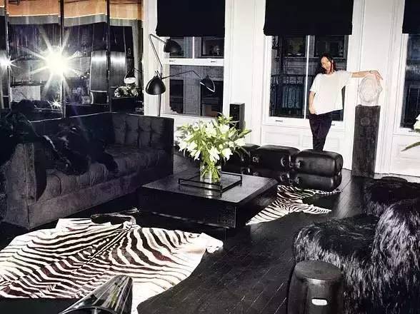 白墙、黑色的天鹅绒沙发、KarlSpringer的咖啡桌、黑色鳄鱼皮餐椅、黑色的Serge Mouille落地灯、斑马纹地毯...这里如同一座黑色的动物园,房间的主人身着白色T恤和黑色牛仔裤,如同他自身给人的印象一样:人生观和世界观不容含糊。