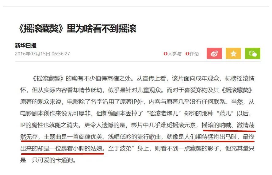 例如,郑钧的摇滚题材动画《摇滚藏獒》、大鹏的《缝纫机乐队》,音乐本身的表现力不够成为观众给出差评的主要原因。就像当年新华日报给《摇滚藏獒》的评价,“摇滚的呐喊、激情荡然无存,主题曲是一首流行歌曲,就像期待猛将出马,最终出来的确实一个裹着小脚的姑娘。”而《缝纫机乐队》无论是各类乐手的客串参演,还是片末合奏的《不再犹豫》,都是在用情怀来填补音乐上的不足。