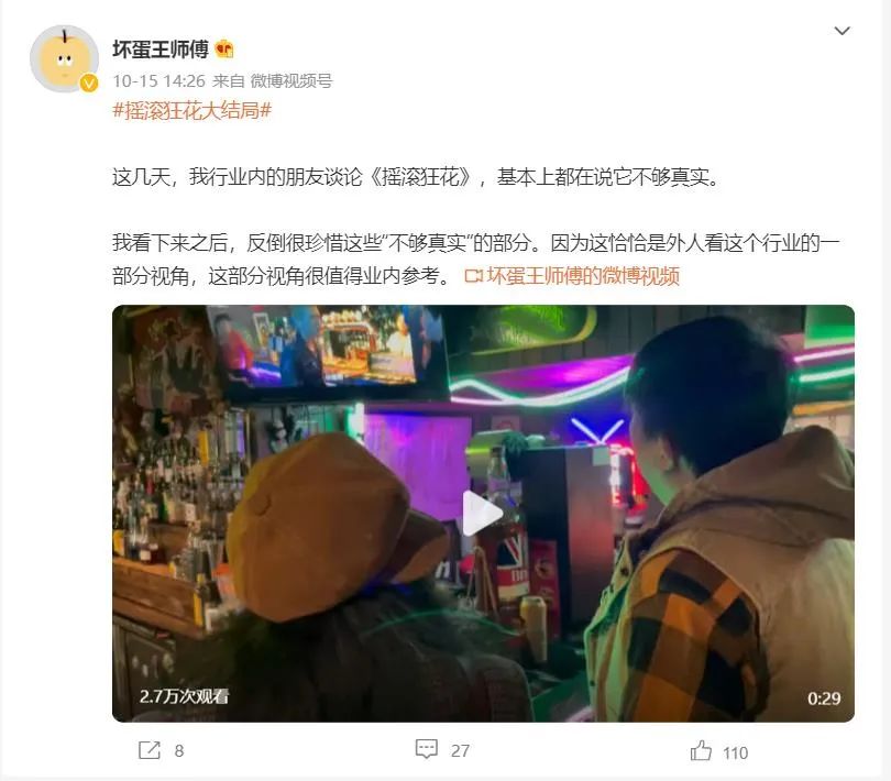 就像坏蛋调频王师傅在微博上的评论:“这几天,我行业内的朋友谈论《摇滚狂花》,基本上都在说它不够真实。”不过,从业者对于这种“悬浮”常怀豁达,“我看下来之后,反倒很珍惜这些“不够真实”的部分。因为这恰恰是外人看这个行业的一部分视角,这部分视角很值得业内参考。”
