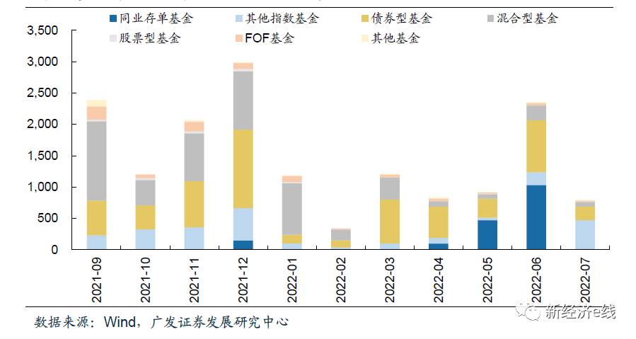 从月度存续总份额来看,2022年5月以来,随着同业存单基金集中成立和单只基金发行份额提升,同业存单基金存续总份额快速上升。5月份额增加471亿份,6月份额进一步增加1034亿份。5-6月期间,平均每10天就有一批同业存单基金获批发行,但6月中旬以后就鲜有同业存单基金通过监管审批。