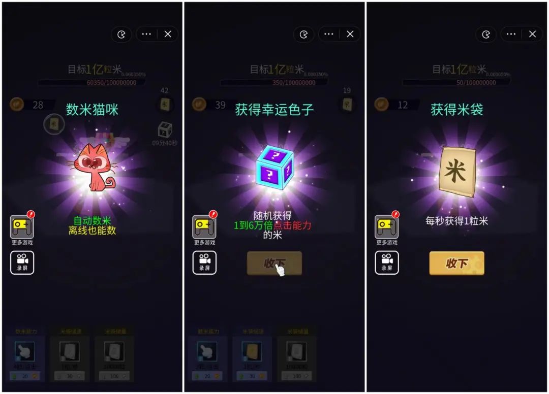 不想数米数到手抽筋的玩家,可以花费金币对能够自动数米的猫咪和米袋进行升级。在这两个帮手的协助下,即使玩家离线或者挂机,也可以不断提升米粒的数量。“欧皇”玩家还可以通过摇骰子的方式,直接获取高倍数的米粒奖励。