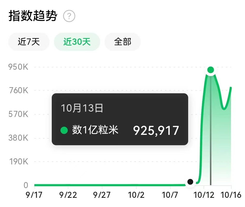 游戏同名关键词“数1亿粒米”微信指数也在这一段时间出现了明显的异动,10月13日,该词的搜索指数增长到顶点,在网友们对“作业事件”进行了热议后,该游戏在15日,16日后的搜索指数再次迎来了一波增长。