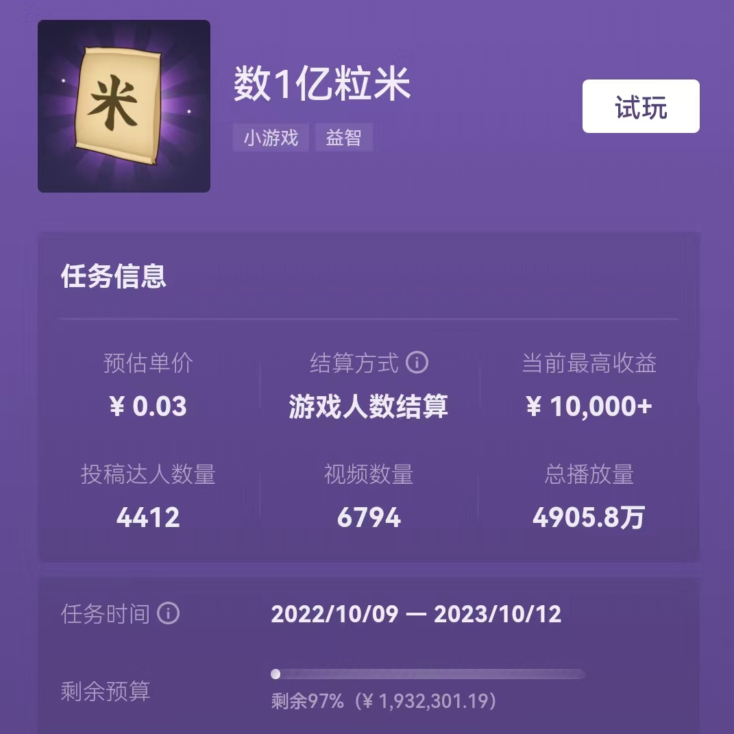 《数1亿粒米》在上线后,迅速登上抖音小游戏热门榜TOP3,目前,该游戏相关话题#数1亿粒米 在抖音站内的播放量累计突破了6500万,抖音发行人计划投稿视频数量超6000条,单条视频最高收益也已经超过了1万元。