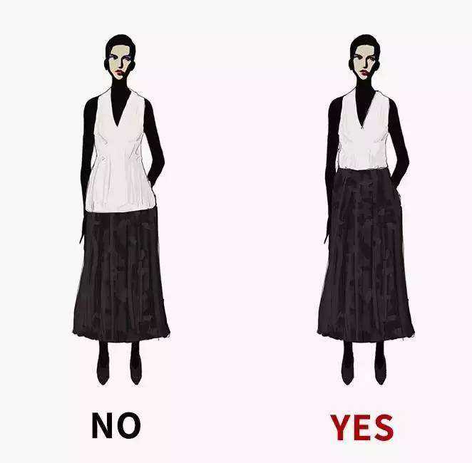 比例不好或者小个子的女生,最好选择短款或膝盖以上的裙子,多露出些腿反而能显高、显瘦。 正好在小腿中段的裙子会从视觉上把腿分成两截。