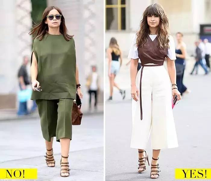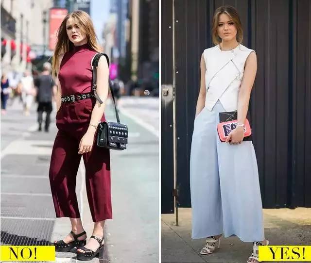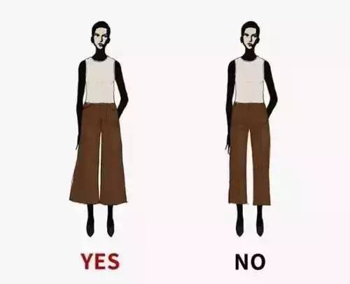 选择一条长及脚面的裤子,如果再搭配一双同色系的鞋子还能延展双腿的长度,7分、5分的直筒裤不仅会显腿短,而且显得小腿粗。